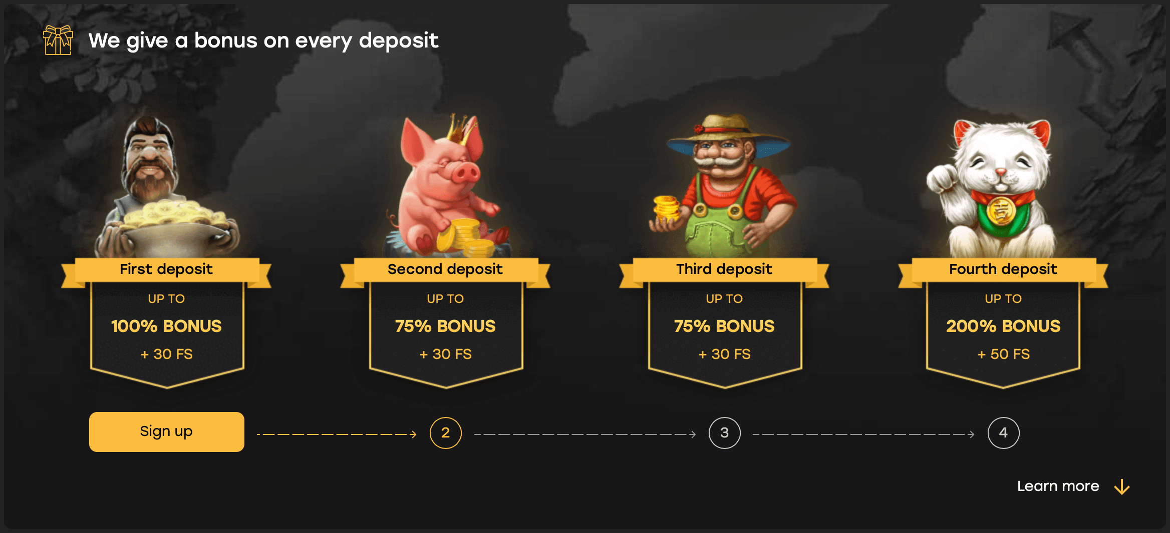 L’offre de bienvenue est répartie sur vos trois premiers dépôts, qui seront doublés en argent bonus. Vous pouvez réclamer jusqu’à 1 000 $ et 170 tours gratuits supplémentaires pour améliorer vos sessions. Le dépôt minimum est de 20 $ et les bonus sont sans condition de mise. Le premier bonus récompensera votre premier dépôt jusqu’à 400 $ !